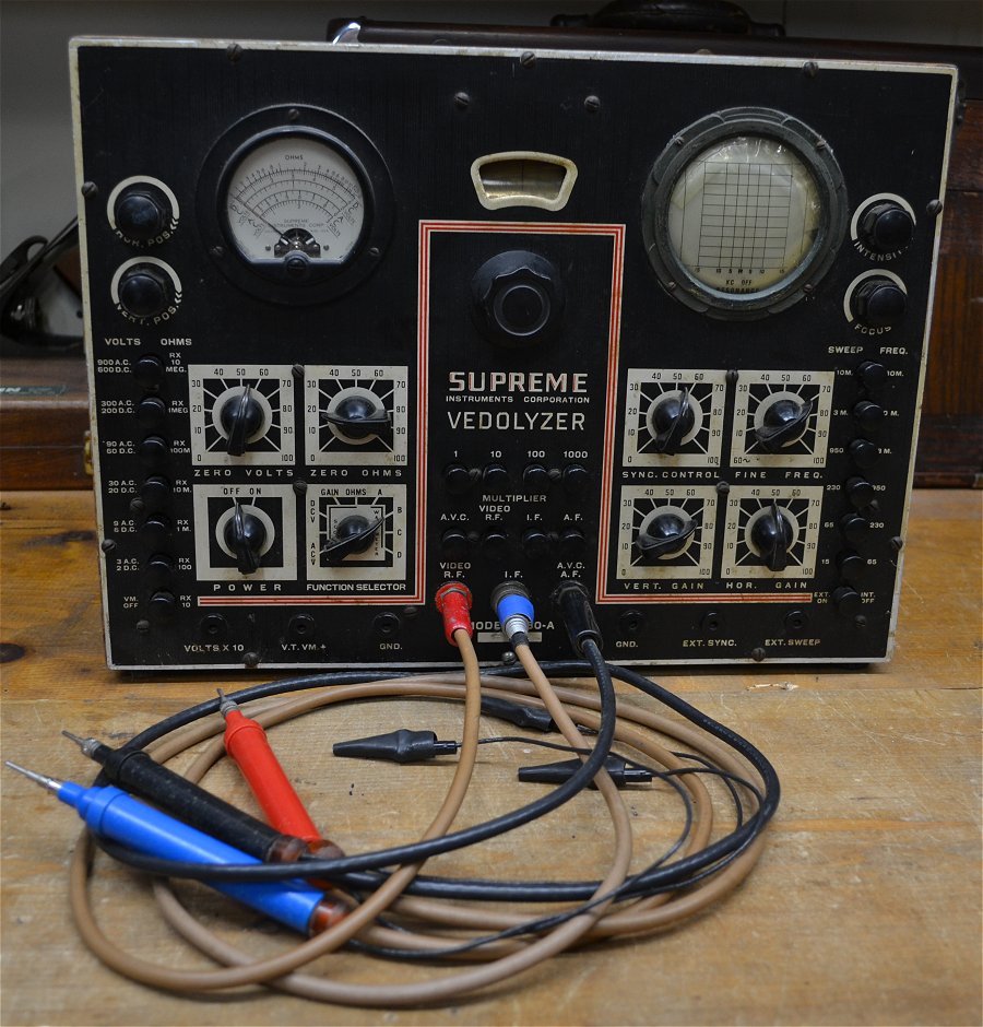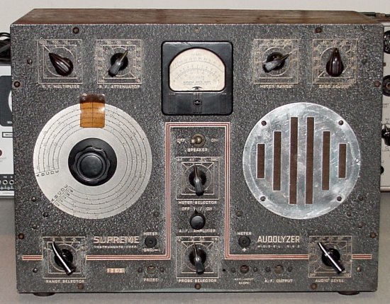 The Supreme 562 Audolyzer is a bench RF and audio signal tracer/meter, ohm meter, and Vacuum Tube Voltmeter (VTVM). Wood case 15½"x11¾"x9".