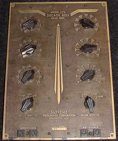 This Supreme model 575 Decade Box was designed for the radio experimenter and laboratory use. It allows selection of both resistance and capacitance.