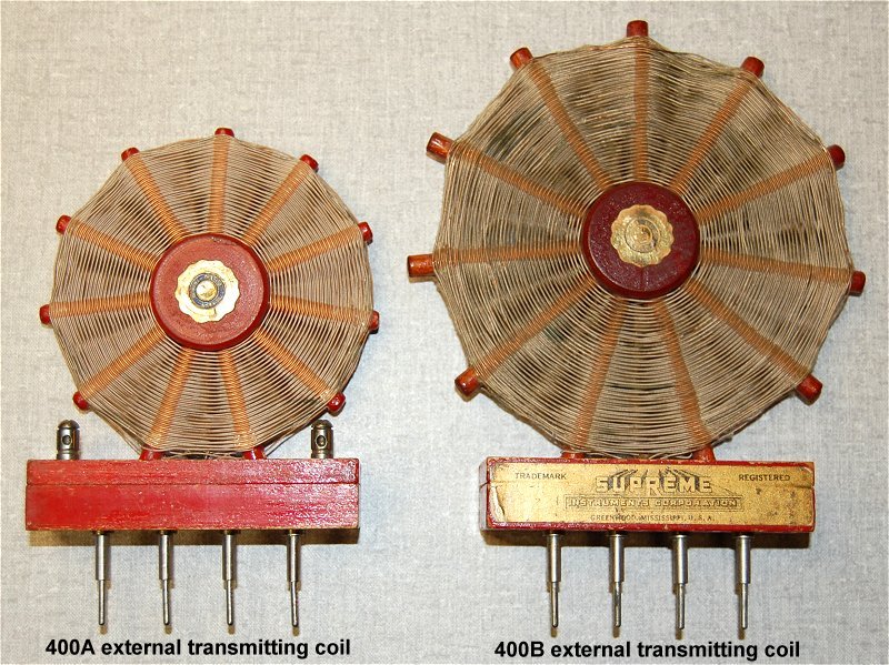 The 4 pin RF Oscillator Antenna has two nickel plated test points on the top of the wooden base. This 400A coil is smaller than the later 400B coil pictured below.