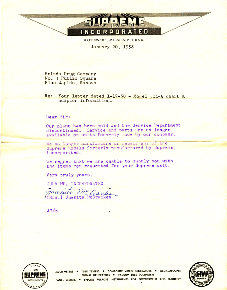 Here's a 1958 letter from "Supreme Incorporated" to a customer looking for information on his Model 504-A tube tester.