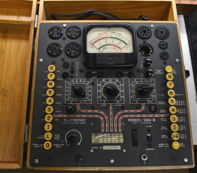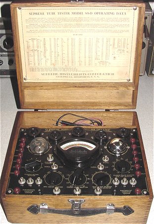 This was made for radio shops front counters and is an early wood cabinet model Supreme 85C Tube Tester.